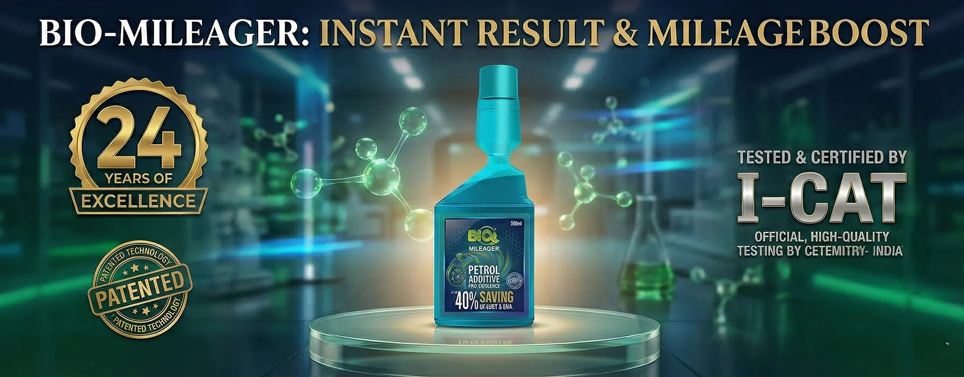 BIO-MILEAGER is a herbal fuel additive formulated from natural plant extracts that are completely safe for both the engine and the environment. It boosts mileage by up to 40%, improves engine pick-up by up to 30%, and reduces pollution by up to 80%, while significantly enhancing environmental quality by increasing oxygen (O₂) levels by up to 80%. Unlike chemical additives, BIO-MILEAGER is eco-friendly, non-toxic, and 100% safer for consumers and vehicle engines, offering superior performance with minimal environmental impact.
